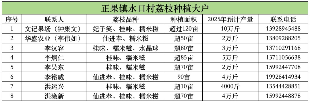 目前,水口村的桂味、糯米糍、仙进奉等品种荔枝已逐步进入最佳采摘期,如果你想要品尝新鲜采摘的荔枝,可以拨打以下表格中的电话咨询购买,支持批量采购。
