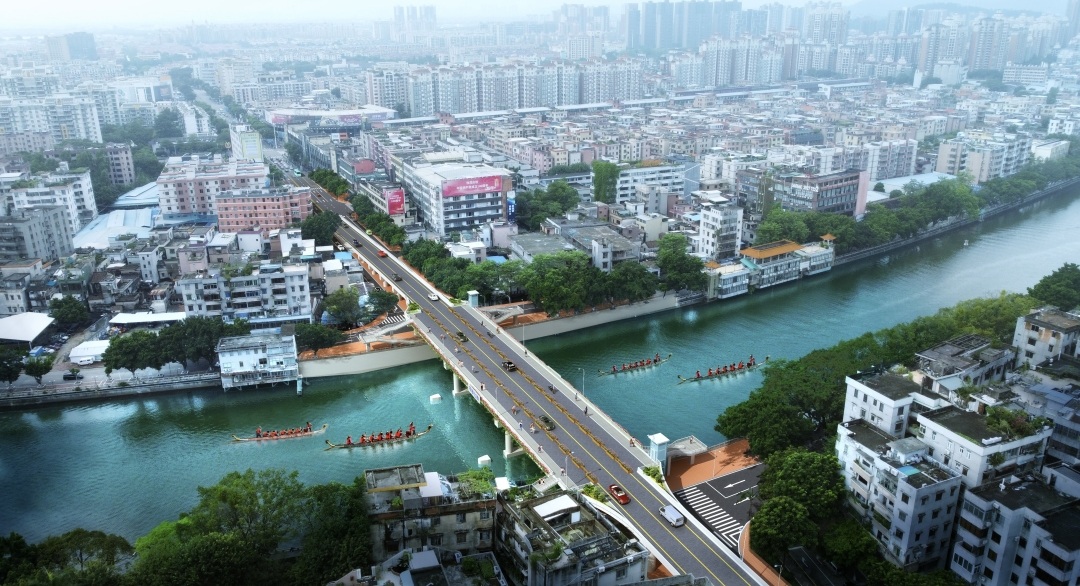 市桥大桥位于市桥街工业路,横跨市桥河,是连接市桥街与桥南街的重要通道之一。改造后的市桥大桥全长250.2米,引桥引道段宽11.0米,主桥段宽21.0米。桥梁采用“2x20米预制砼空心板+2x16.6米UHPC预制工字梁+(34+34+33)米预制小箱梁+2x18米UHPC预制工字梁+2x20米预制砼空心板”的简支梁桥跨组合,继续保持双向两车道通行。