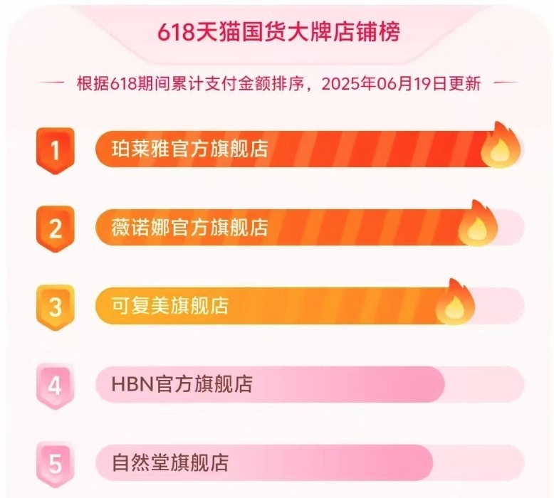 记者还留意到,薇诺娜作为国货头部品牌的代表,今年也有点滑落的趋势。数据显示,品牌今年618在天猫平台的排位稳定在第12位和第14位间徘徊,如首日排第12,第一阶段排第14,收官排第12,但总体都要比2024年618全周期排第10的成绩要差。