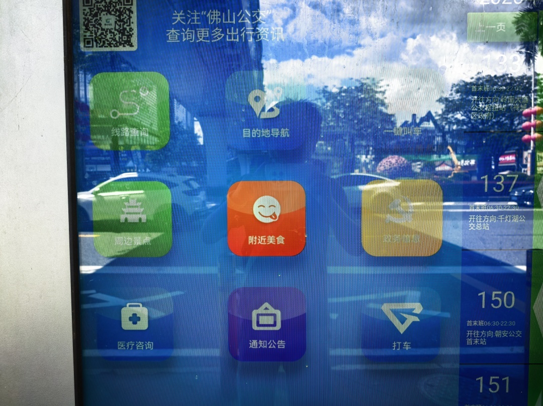 在“季华四路东站”公交站采访期间,记者发现,来到这块大型站牌前“仰望”的乘客寥寥无几。原来,这个公交站并非像网络上吐槽的“一无是处”,而是“内有乾坤”。在该站中部,有一个巨大的电子触控屏,它便是这个公交站的“智慧脑”。触控屏的上半部分,可以滚动播放各种视频资讯,而下半部分不仅能滚动更新途经该站的公交线路运行信息,还能通过联网提供线路查询、一键叫车、周边美食、政务信息、周边景点等便捷服务。