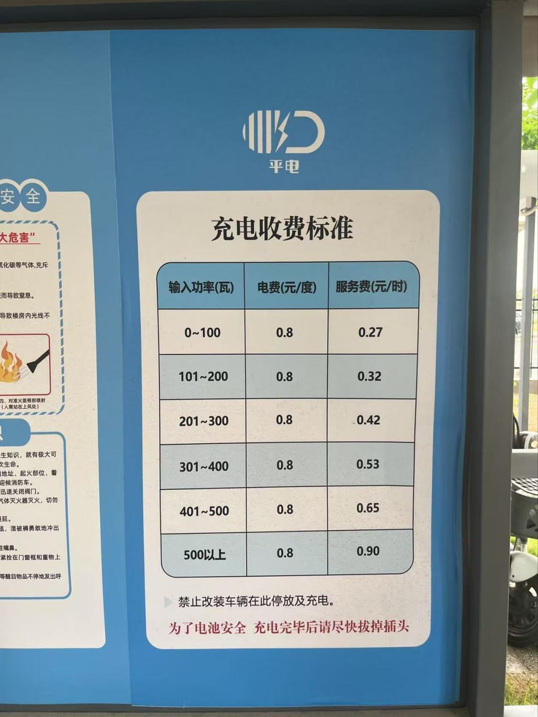 平电公司公布的收费标准显示,电费收费标准是0.8元/度,而服务费收费标准则根据电动车的功率大小有所不同,100瓦以内0.27元/小时,500瓦以上则是0.9元/小时。66物联公司的收费标准显示,电费是0.8元/度,服务费是200瓦以内0.4元/小时,600瓦以上1.2元/小时。