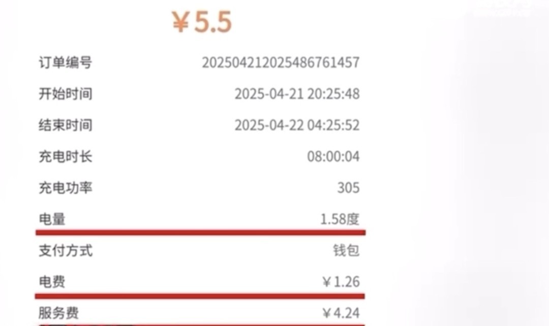 一住户向记者出示的平电充电账单显示,充电1.58度,电费为1.26元,服务费却是4.24元。另一位居民向记者出示的“66物联”充电账单显示,充电电费是0.86元,服务费是3.15元。