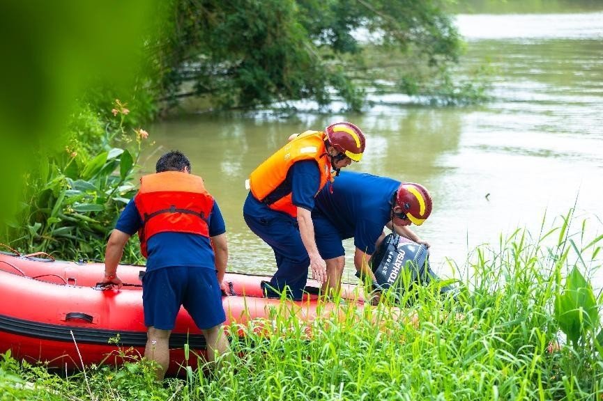 演练现场,模拟太平镇遭遇持续性强降雨,从化区气象台随即发布暴雨红色预警信号,并启动防御暴雨一级(红色)应急响应。流溪河太平河段水位急速攀升,工作人员发现水南村新城庄多名群众被困,请求紧急救援。太平镇三防指挥部即刻启动应急预案,救援队伍迅速驾驶冲锋舟进行现场救援。