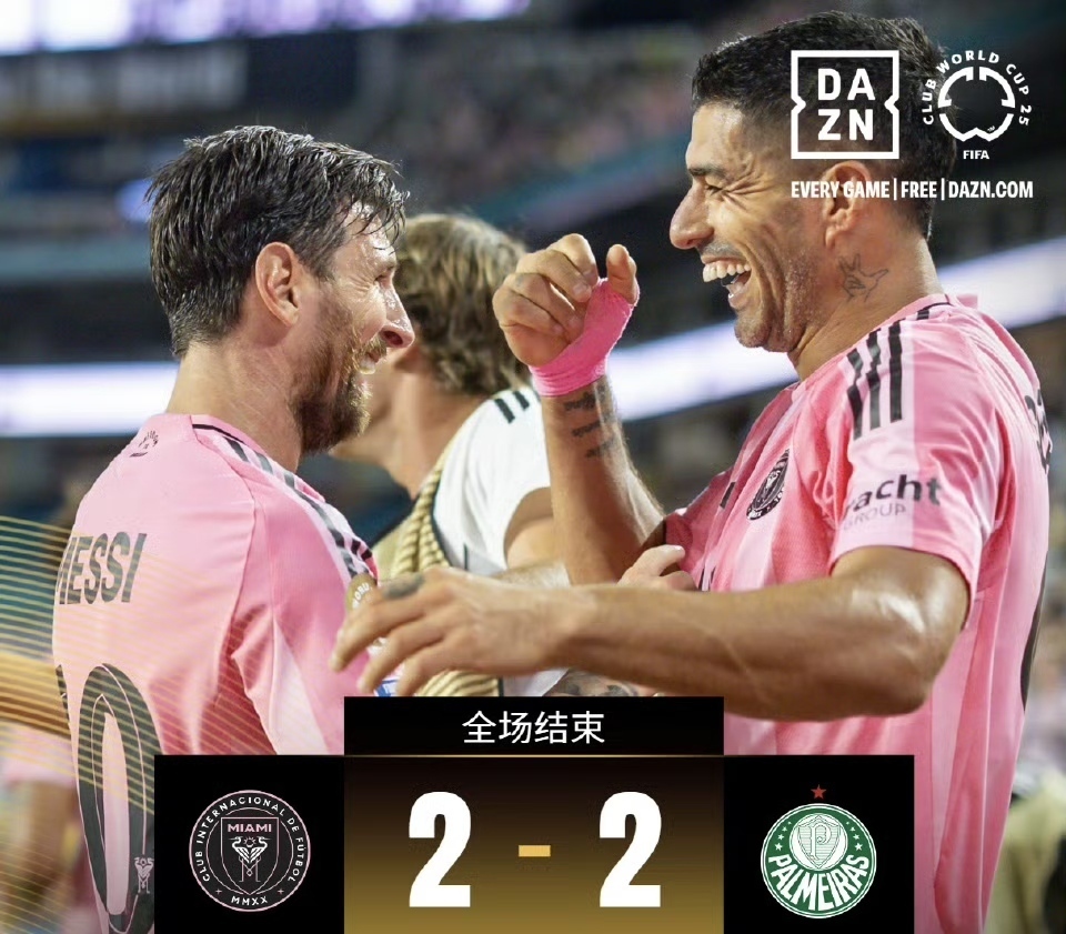 A组第3轮,迈阿密国际对阵帕尔梅拉斯,两队都仅需1分即可出线,结果双方战成2比2平。“苏牙”发威,他在上半场助攻阿连德单刀先拔头筹,下半场又“一条龙”破门,虽然对手最后连扳两球,但双方握手言和,同积5分携手晋级,帕尔梅拉斯以净胜球优势排小组第一,迈阿密国际小组第二。帕尔梅拉斯也的确是赢家,特别是他们的小将埃斯特旺,他先后成功跟梅西和苏亚雷斯交换了球衣。同组的另一场比赛,波尔图与开罗国米也战成4比4平双双出局。