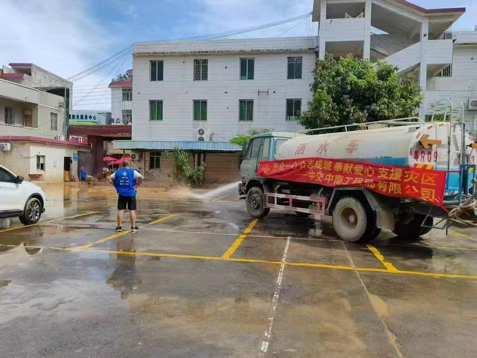 6月19日,影响怀集县的强雷雨团已经减弱,当天下午,广肇、广云高速改扩建项目主动请缨,又组建了一组抢险突击队,调配了3辆洒水车,30名人员,帮助肇庆怀集清理淤泥,冲洗街道等。
