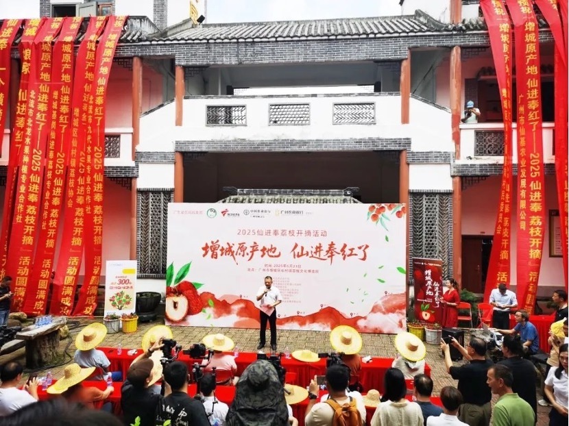 6月23日,2025仙进奉荔枝开摘活动在广州市增城区仙村镇荔枝文化博览园举行。国家荔枝龙眼产业技术体系首席科学家陈厚彬,国家荔枝龙眼产业技术体系岗位专家、华南农业大学教授李建国,仙村镇党委、增城区农业农村局负责人,广东广播电视台名嘴郑达,七省(自治区、直辖市)荔农代表及近百名嘉宾齐聚增城,共同见证甜蜜时刻。