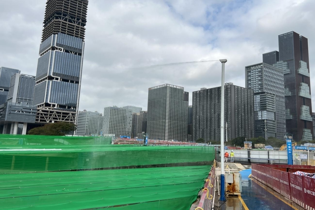 从深圳留仙洞战略性新兴产业总部基地远眺,中建科工七街坊联建大厦项目施工建设如火如荼,这里却颠覆了人们对传统工地“尘土漫天、噪音轰鸣”的固有印象。项目部积极贯彻政府主管部门扬尘、噪声治理的相关文件精神,安装集防尘、降噪、遮阳、降温等诸多功能于一身的“智能天幕”系统,以实际行动践行绿色建筑发展理念。这座深圳南山区的未来产业地标,正以科技赋能的“静音净尘”模式,创新开展城市核心区绿色施工。