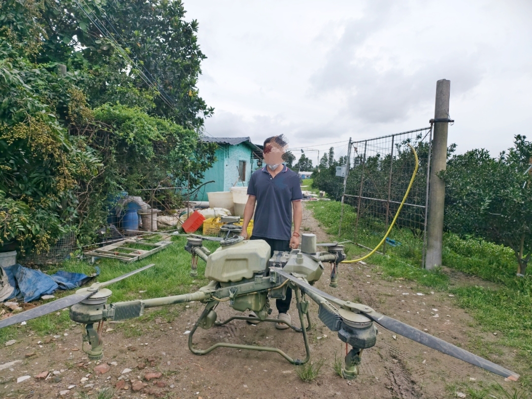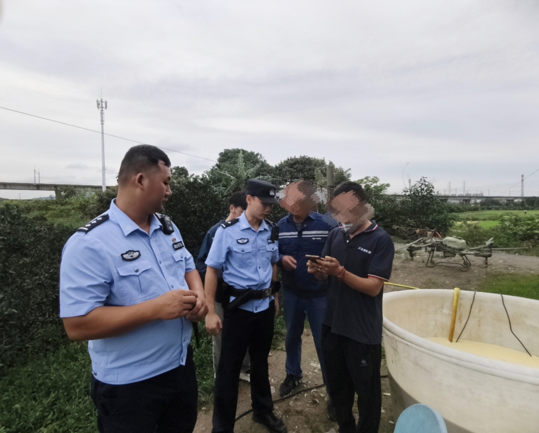 接报后,民警迅速赶赴现场寻找无人机操作手。与此同时,铁路供电、工务部门也及时反馈工作中发现该“黑飞”情况。最终,民警在广珠城际江门支线K70+635M附近一柑园内,将正在进行农药喷洒作业的无人机操作手徐某及相关设备查获,随后依法将其传唤至派出所接受调查处理。