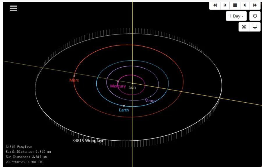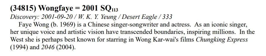 记者从国际天文学联合会小天体命名工作组(WGSBN)发布的官方公告中获悉,6月9日,经国际天文学联合会小天体命名工作组批准,由国际上最多产的小行星猎手之一杨光宇发现的编号第34815号小行星被正式命名为“王菲星”。