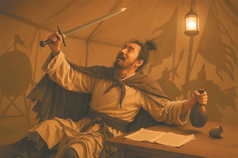 许丕文用AI模型生成诗人辛弃疾“醉里挑灯看剑”的图片。
