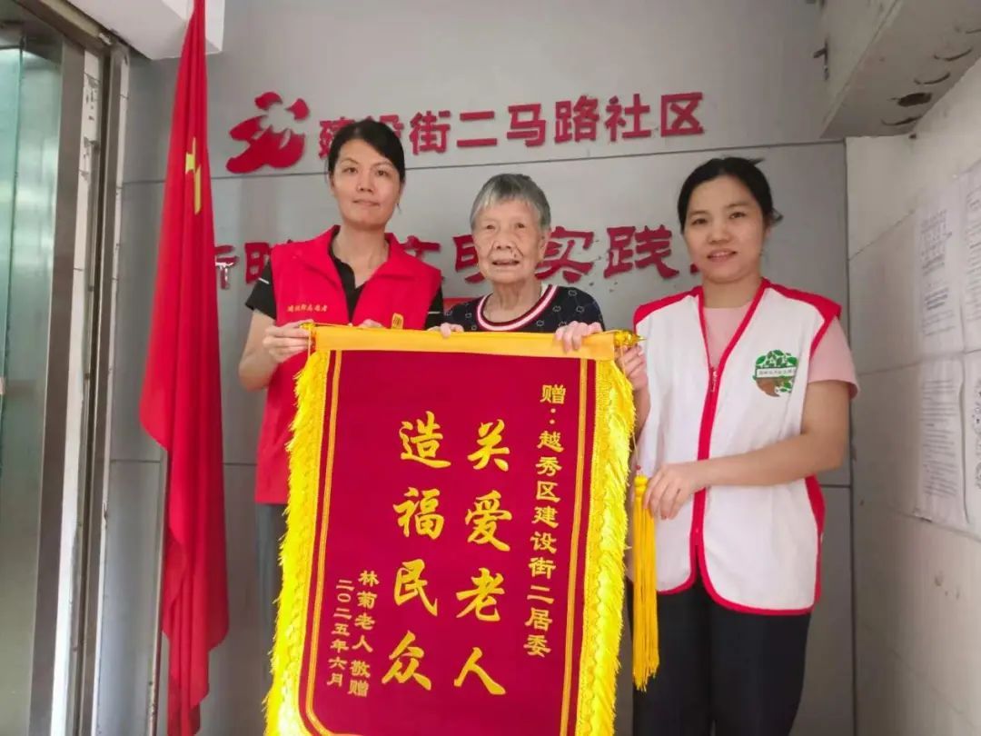 近日,87岁高龄的林姨在家人的陪同下,手捧感谢锦旗来到建设街二马路社区居委会。锦旗上书写着“关爱老人、造福民众”的感谢文字,这也是老人向社区居委会全体工作人员送上的最诚挚的感谢。