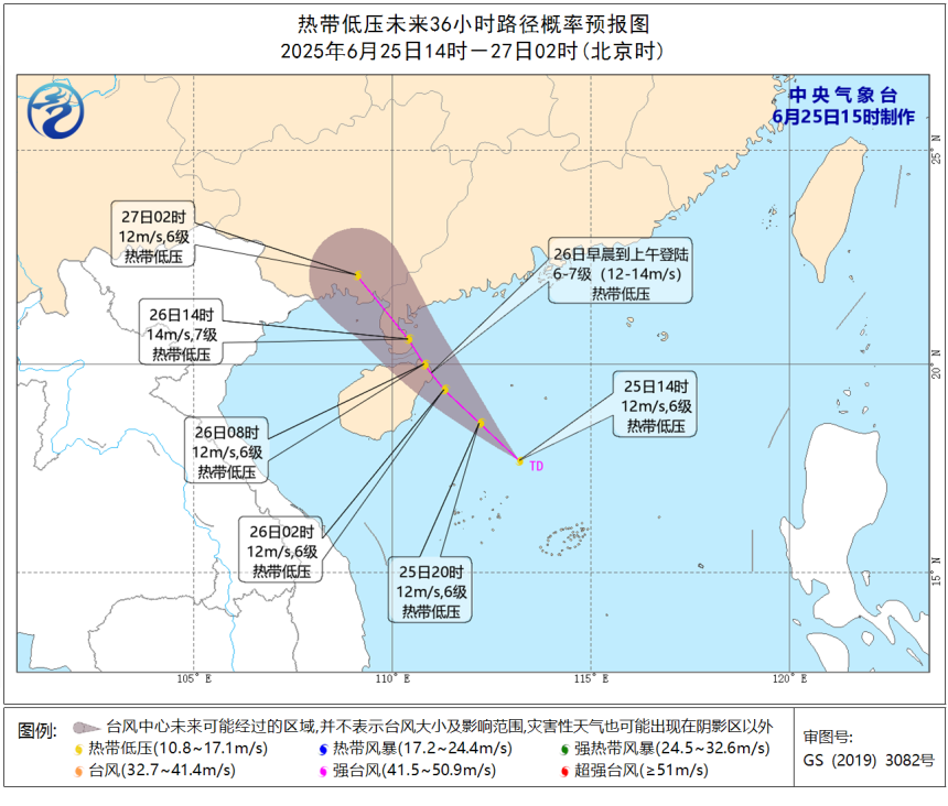 预计,25—26日,热带低压将向西北方向移动,趋向海南岛东部到广东西部一带沿海,强度维持或略有加强,最大可能以热带低压强度(6—7级)于26日早晨到上午在上述沿海登陆。