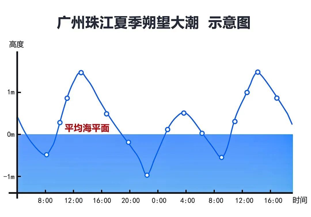 据测算,珠江广州河段连续三天最高水位的时间:6月26日约13时10分,6月27日约13时50分,6月28日约14时40分。最大潮差(水位最高减最低)约2.7米。6月28日以后,最高水位将会明显回落,天文大潮仅持续几十分钟高水位就下降。