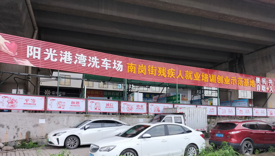 2024年4月,阳光港湾洗车场就业帮扶点揭牌成立。作为黄埔区第五届公益创投活动资助项目,这个看似普通的洗车场承载着不普通的使命。正如“阳光港湾”这个名字的寓意,这里既是工作场所,更是特殊人群的心灵避风港。