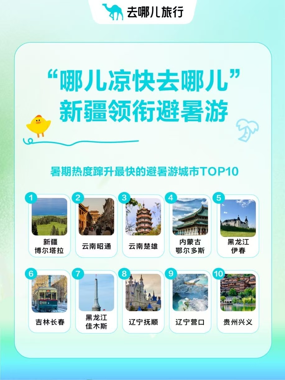 从数据来看,西北、云南和东北等平均温度低于25摄氏度的地区,成为避暑游首选目的地,酒店预订增幅位居前列。去哪儿平台上暑期热度蹿升最快的避暑游城市前十位为:新疆博尔塔拉、云南昭通、云南楚雄、内蒙古鄂尔多斯、黑龙江伊春、吉林长春、黑龙江佳木斯、辽宁抚顺、辽宁营口和贵州兴义。新疆博尔塔拉酒店预订量同比去年增长3倍,是今年暑期增速最高的城市。