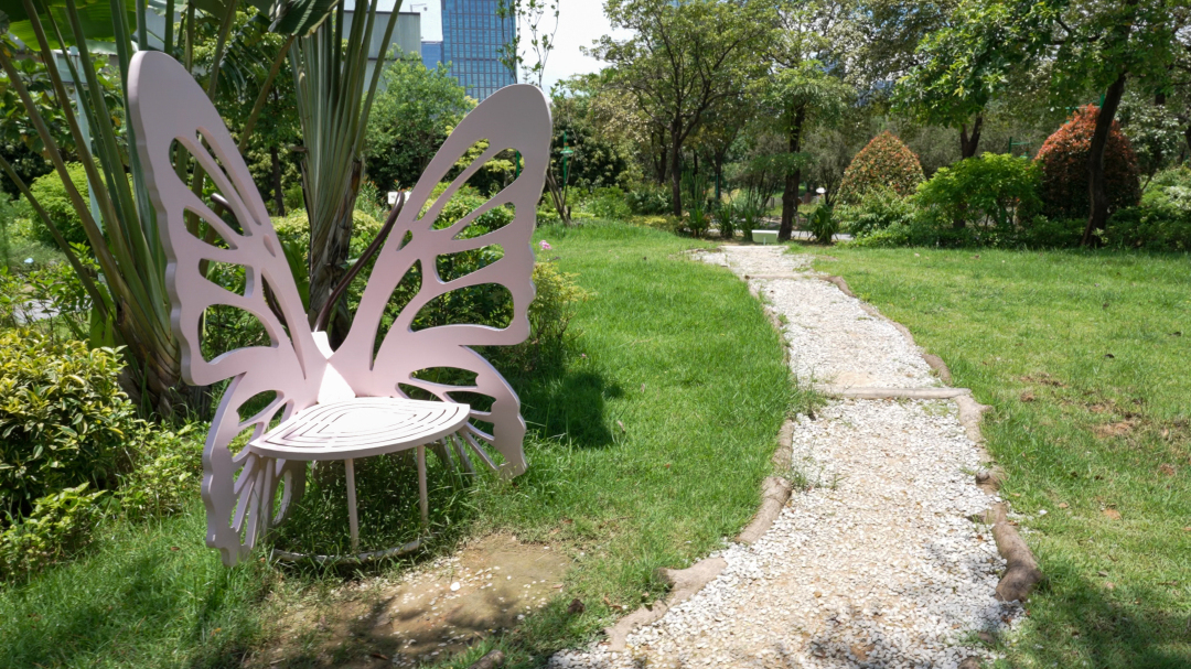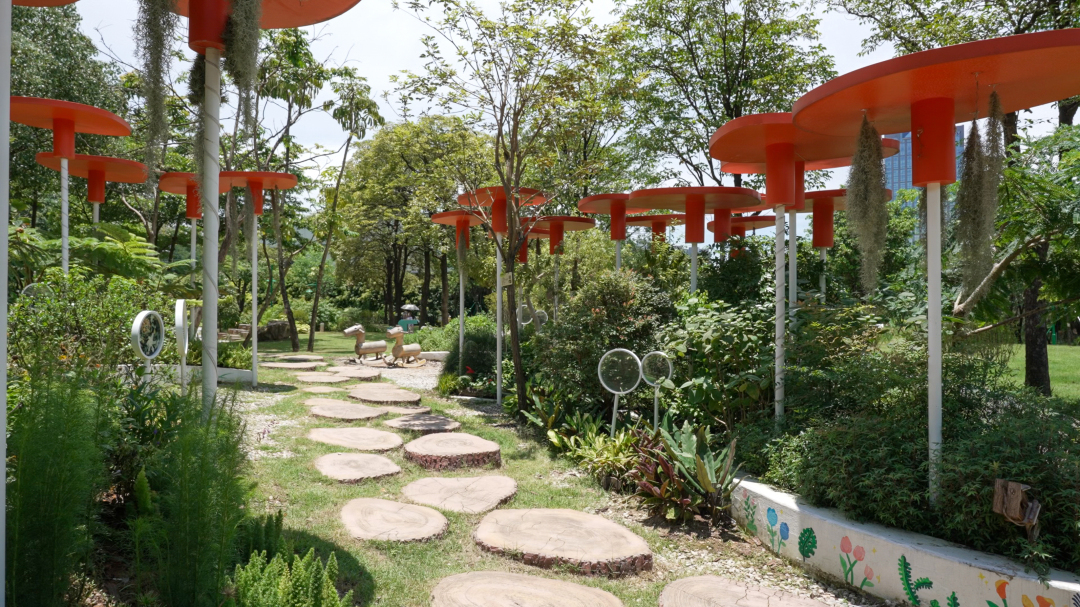 走在生态花园沿途的路上,只见曲径通幽的路上花草错落。走近柠檬香桃木、薄荷、迷迭香、栀子花等天然芳香植物,可闻到沁人心脾的香气;途经生态岛、绿创空间、树间小径时,能听到画眉、八哥、太阳鸟的清脆鸟鸣和风穿过树叶的沙沙低语,仿佛在听一场“自然音乐会”。沿途还有草地、木桩、树皮、砂石……这些自然界的“材质样本”,全被“请来”成为小径的一部分,其中还有由手作步道师和亲子家庭共同完成的“蝴蝶手作步道”。在步道上,孩子可以脱掉鞋子,赤脚行走其上,感受松软、粗糙、光滑等丰富触感,刺激自身感觉统合发展。