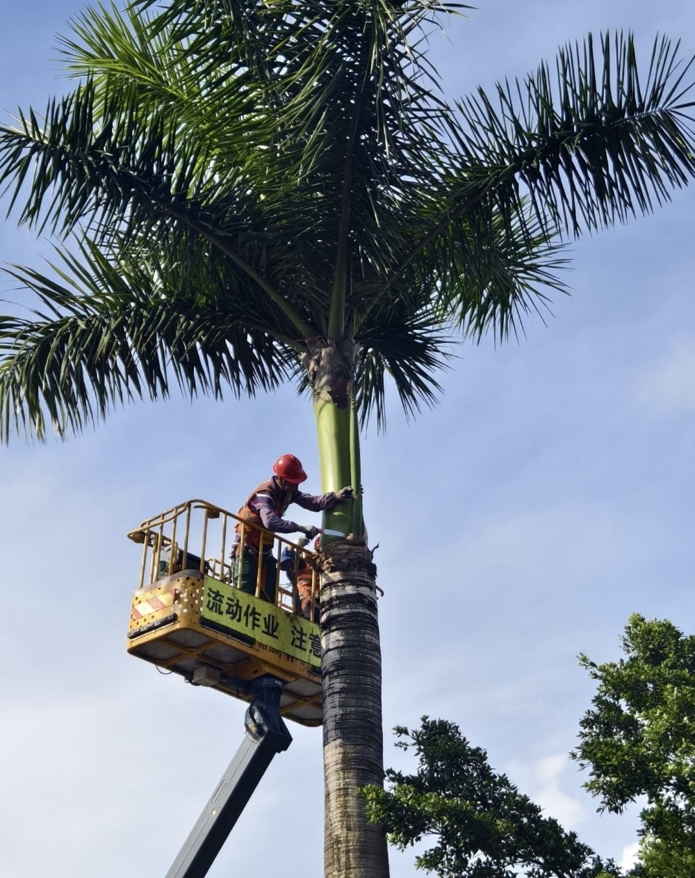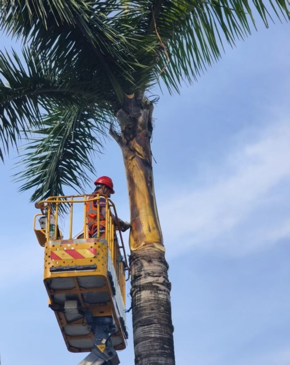 6月24日下午,记者在亚运大道金海岸花园路段看到,番禺区岭南绿化工程有限公司的工程车和工作人员正在修剪绿化带里的大王椰。大王椰高大挺拔,有10多米高,工作人员操作一辆高空作业车,两人站在升降台上,手持油锯,将树干上有可能掉落的老树叶修剪下来,一片树叶起码有10多斤重。将老树叶清除后,工作人员再在树干顶部绑扎扎带,预防大王椰树叶枯萎后掉落。
