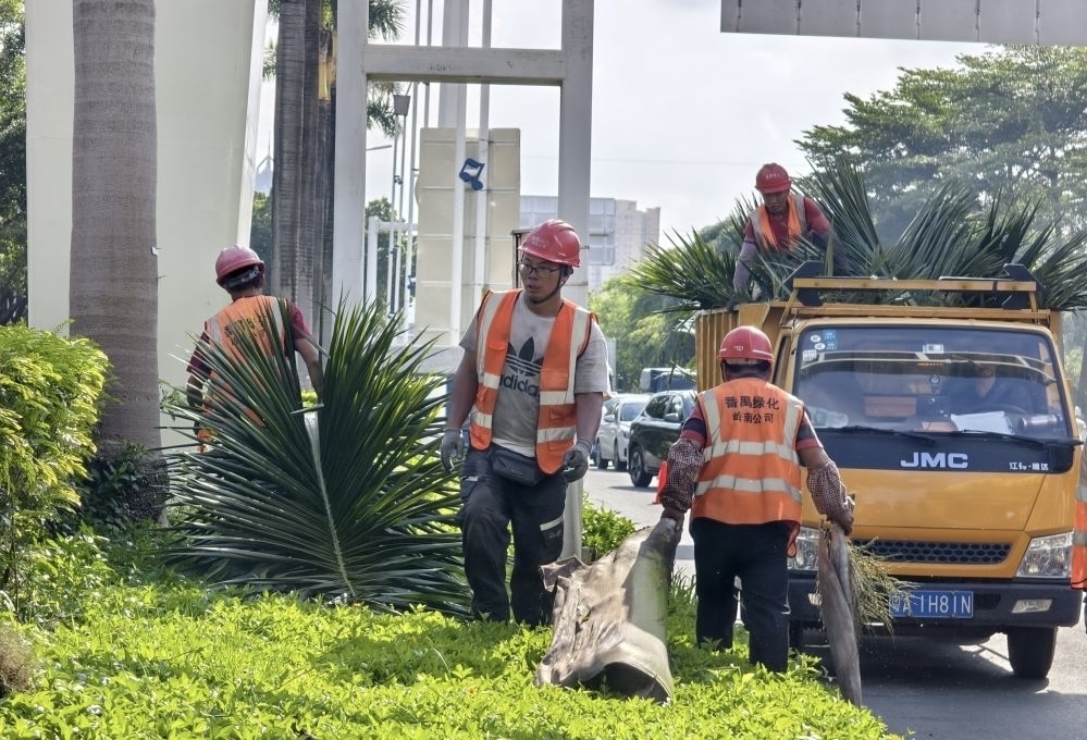 该工作人员表示,通过他们连续三天的忙碌,到当天下午4时多,随着金海岸花园与城区大道相交路段一棵大王椰树修剪、绑扎完毕,上述路段大王椰树的修剪和绑扎全部完成。