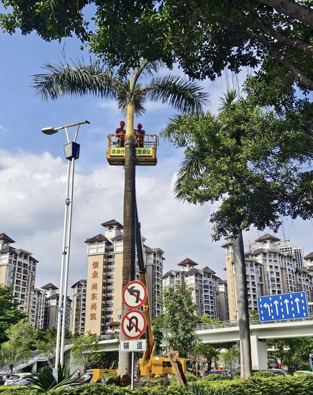 近日,广州市番禺区绿化管养单位组织人员、机械设备对亚运大道沿线绿化带的大王椰进行修剪,保障车辆和行人通行安全。