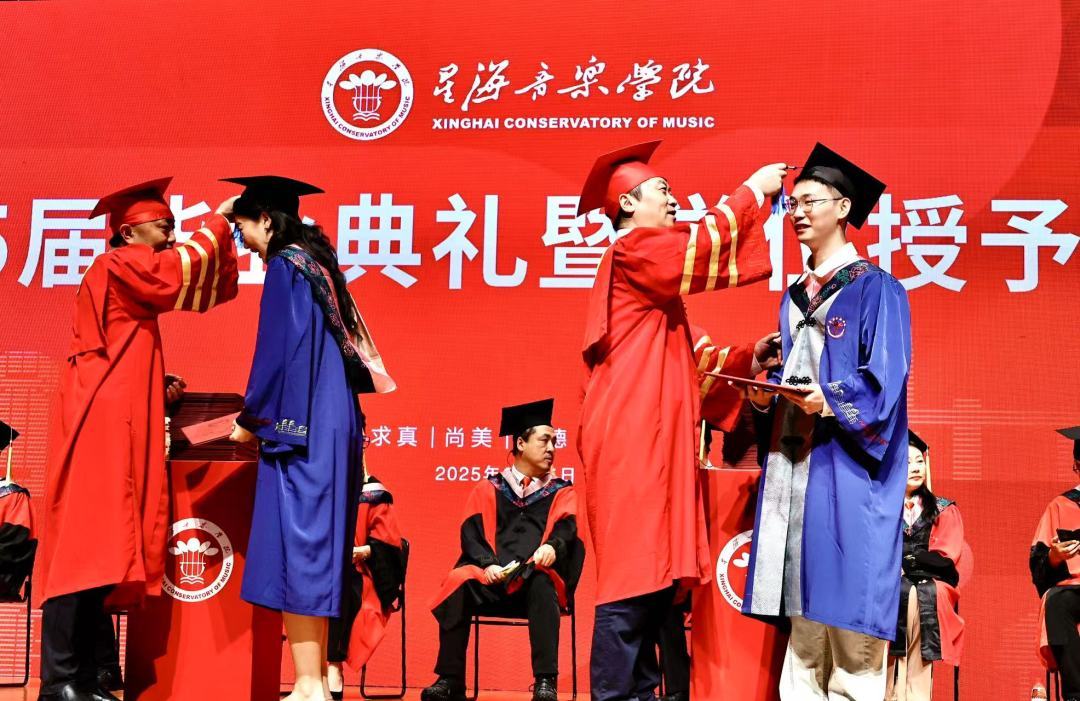 6月25日下午,星海音乐学院2025届毕业典礼暨学位授予仪式在大学城校区音乐厅举行。