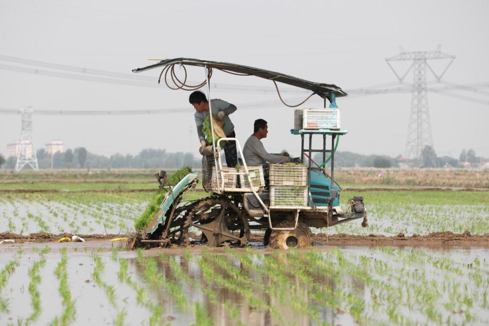 △2025年5月,农民在河北沧县南堤村的盐碱稻田进行插秧作业。
