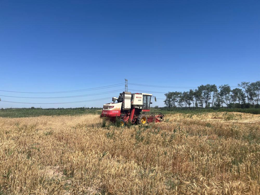 △收割机在山东武城县郝王庄镇的耐盐碱小麦试验示范基地里作业。