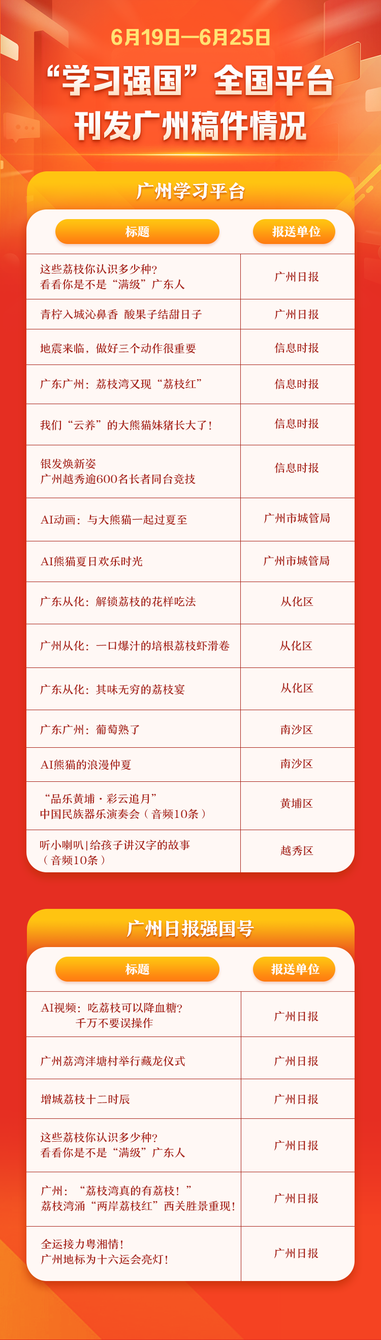 6月19日—6月25日“学习强国”全国平台刊发广州稿件情况
