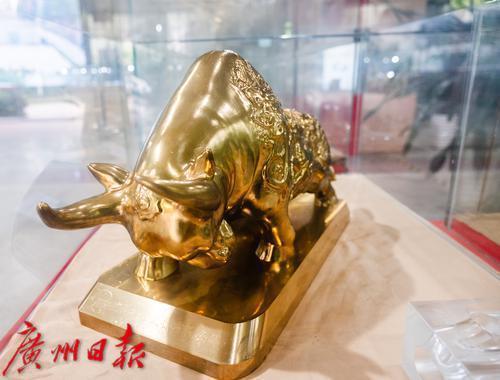 广州数控展厅,由“笨重”的工业设备“雕”出来的“华尔街牛”模型。