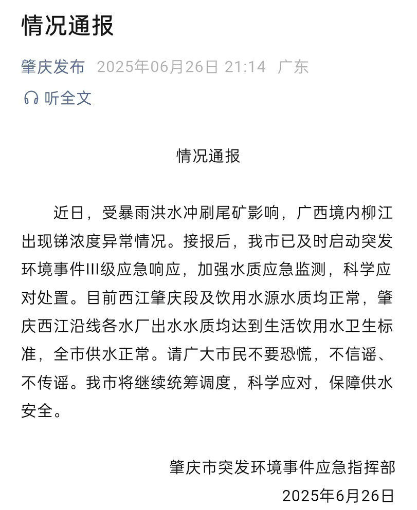《情况通报》称,近日,受暴雨洪水冲刷尾矿影响,广西境内柳江出现锑浓度异常情况。接报后,肇庆市已及时启动突发环境事件Ⅲ级应急响应,加强水质应急监测,科学应对处置。目前西江肇庆段及饮用水源水质均正常,肇庆西江沿线各水厂出水水质均达到生活饮用水卫生标准,全市供水正常。请广大市民不要恐慌,不信谣、不传谣。肇庆市将继续统筹调度,科学应对,保障供水安全。