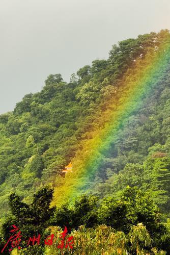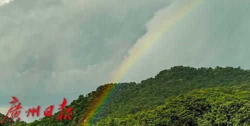 2025年6月26日清晨,广州天空晴朗,一阵小雨不约而至,金光朝阳下一道彩虹从白云山伸向空中,眼前出现云山阳光雨彩虹景象。