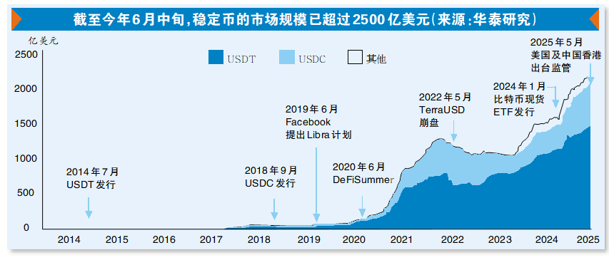 回顾稳定币发展历程,2020年全球稳定币市值仅为200亿美元,而到今年5月已飙升至2500亿美元,五年间实现了11倍增长。