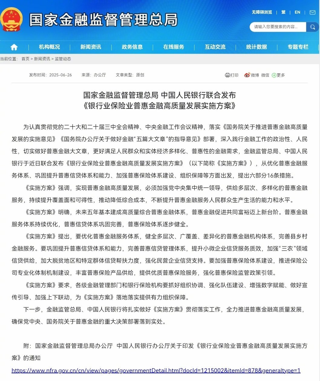 国家金融监督管理总局、中国人民银行近日联合发布《银行业保险业普惠金融高质量发展实施方案》(以下简称《实施方案》),从优化普惠金融服务体系、巩固提升普惠信贷体系和能力、加强普惠保险体系建设、组织保障等方面出发,提出六部分16条措施。