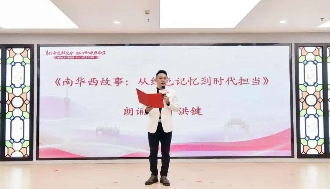 活动还精心融入了丰富多彩的文艺表演,增添了现场感染力与社区温情。福安幼儿园的孩子们充满活力与童趣的《功夫献艺庆七一》舞蹈传递着新生代对党的纯真热爱与美好祝福;南华西卓别林艺术团倾情演绎的小品《南华益家亲》,取材于“南华闪电修”服务队的真实感人事迹,生动再现了社区邻里情深、党群同心互助的温暖画面,赢得现场观众的共鸣。星辉艺术团带来的舞蹈《梅花赋》,以优美的舞姿将现场气氛推向了又一个高潮。广州市文化馆演艺部于洪键带来的朗诵《南华西故事:从红色记忆到时代担当》,以深情的语言回顾了街道的红色基因与奋斗历程,激励党员干部在新时代新征程上奋勇前行。