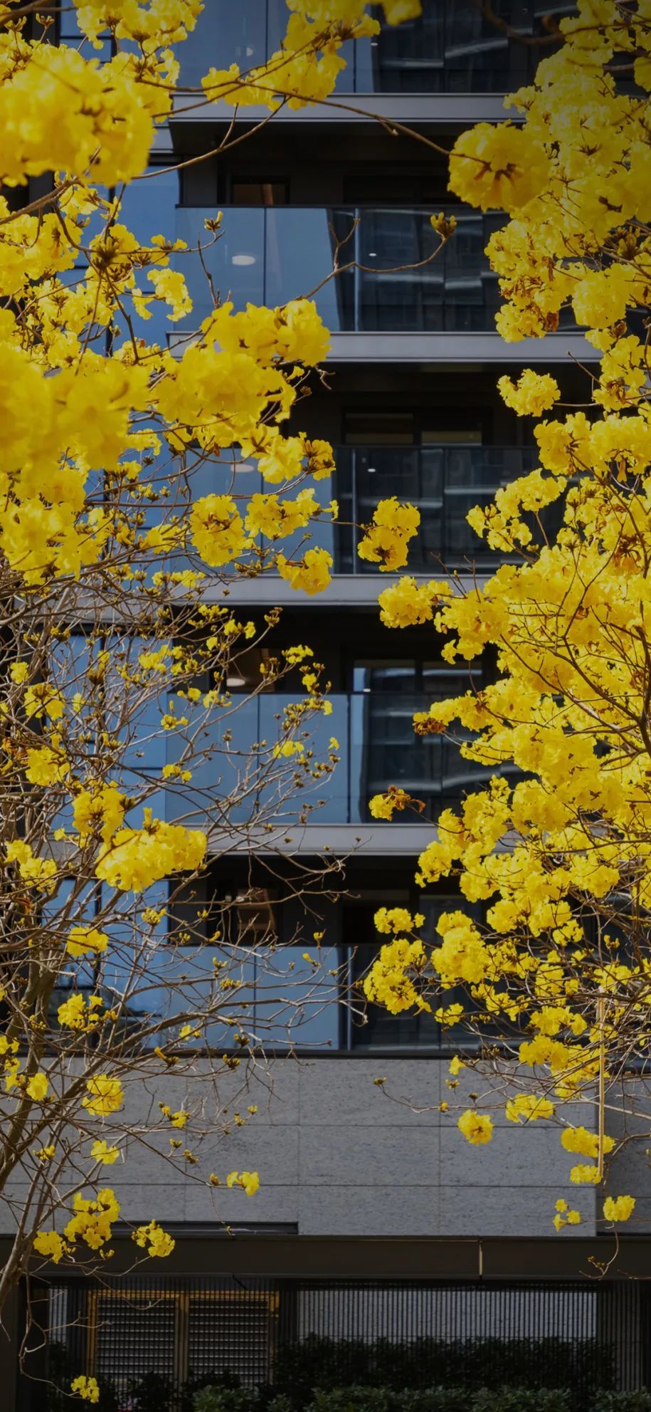 城市之光的玻璃幕墙和黄花风铃木。