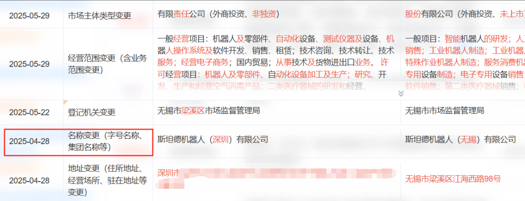 业界留意到,尽管公司发迹于深圳并获评国家级专精特新“小巨人”,其公司“斯坦德机器人(深圳)有限公司”却在2025年4月底更名为无锡企业,地址变更为无锡市梁溪区。这一变动引发业内讨论,但公司未公开回应具体原因。
