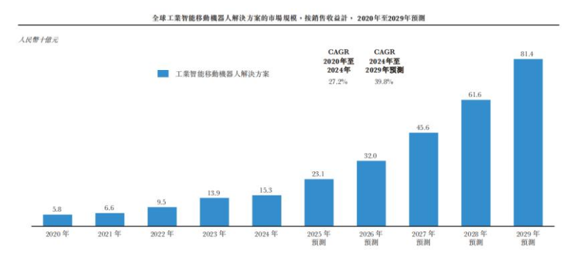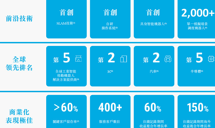 目前,斯坦德的产品已应用于3C、汽车、半导体等行业,与华为、富士康、OPPO等400多家龙头企业合作。据灼识咨询数据,按2024年销量计算,斯坦德是全球第五大工业智能移动机器人解决方案提供商,同时也是第四大工业具身智能机器人解决方案提供商。