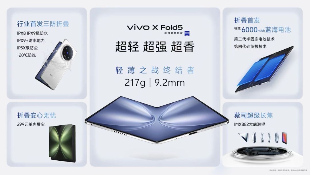近日,vivo正式发布新一代折叠旗舰vivo X Fold5,机身轻至217g,打破了vivo上一代折叠屏X Fold3保持的219g轻薄纪录,再一次定义大折叠机型轻薄新标准。在超轻的基础上,vivo X Fold5体验全面进化,实现折叠屏性能的全面进阶。