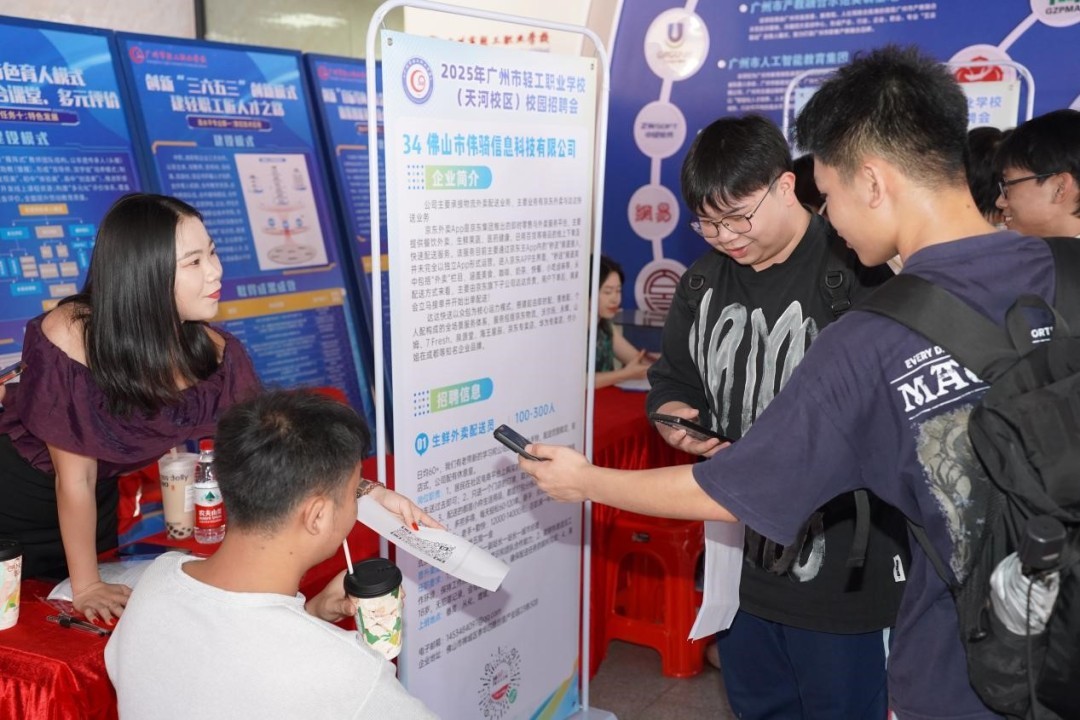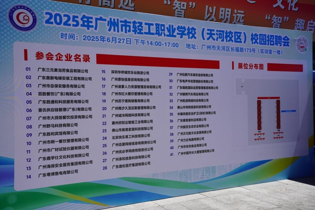 6月27日,广州市轻工职业学校(下称“广州轻职”)2025年校园招聘会在科教城校区、天河校区同步举行。80余家优质企业携3952个岗位进场揽才,吸引了本校及周边兄弟院校约1200名学子踊跃参与。