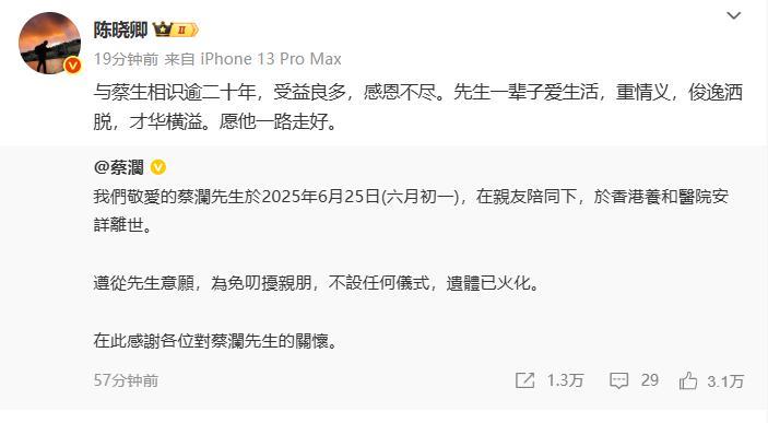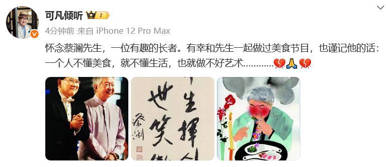 《舌尖上的中国》导演陈晓卿发文悼念:与蔡生相识逾二十年,受益良多,感恩不尽。先生一辈子爱生活,重情义,俊逸洒脱,才华横溢。愿他一路走好。