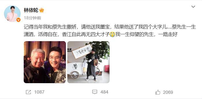 林依轮:记得当年我和蔡先生撒娇,请他送我墨宝,结果他送了我四个大字儿……蔡先生一生潇洒,活得自在,香江自此再无四大才子,我一生仰望的先生,一路走好 。
