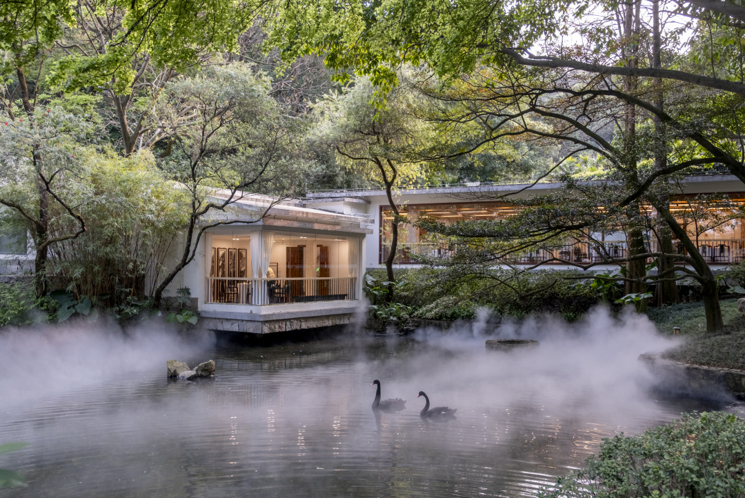 前院是进入山庄旅舍的第一景。开敞的庭园绿意盎然,湖面上薄雾升腾,黑天鹅悠然游弋。
