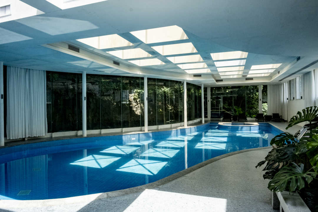 元首套房游泳池有着独特的天窗、细柱,整体造型明快简洁。