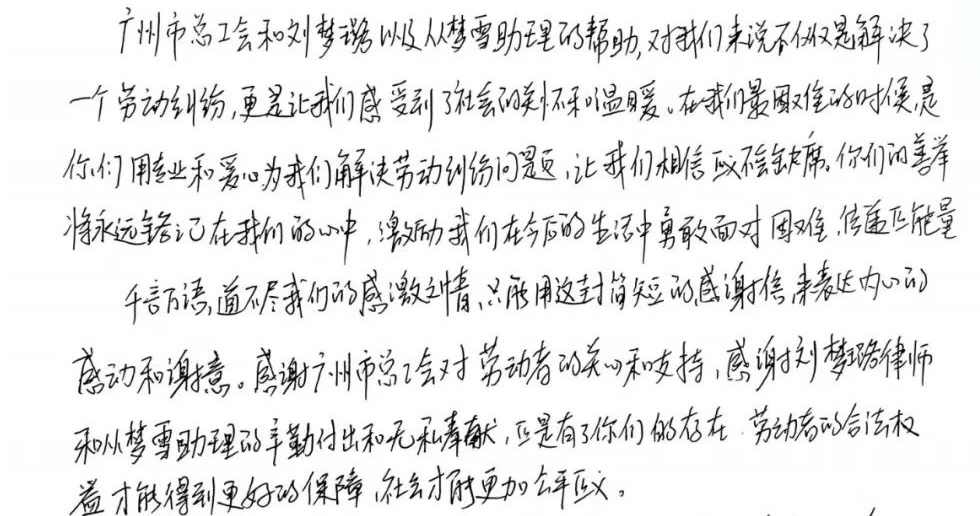 近日,广州市总工会收到一封特殊来信。展开这封有两页信纸的手写来信,里面记录着广州工会律师为三位职工追回欠薪与争取经济补偿金13万多元的全过程。