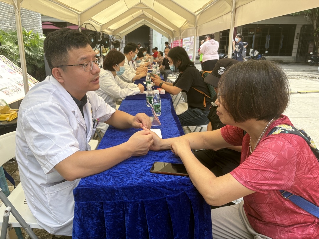 义诊现场,党员医务工作者为居民提供一对一诊疗服务,针对夏季多发的感冒、冒汗、胃肠不适等问题,结合脉诊、舌诊等中医手段辨证施治。活动现场同步设置血压、血糖测量区,帮助中老年人及时掌握基础健康指标。不少居民闻讯而来,有序排队候诊。