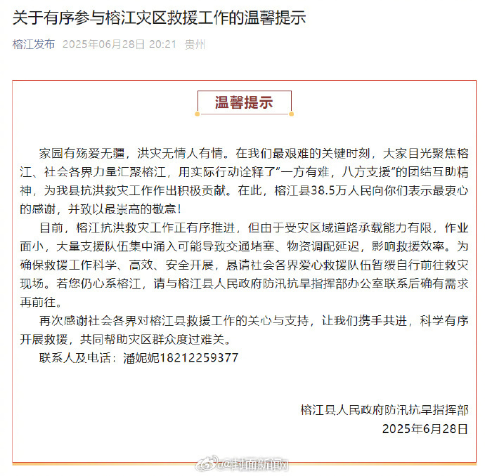 6月28日,贵州榕江县人民政府防汛抗旱指挥部发布关于有序参与榕江灾区救援工作的温馨提示:目前,榕江抗洪救灾工作正有序推进,但由于受灾区域道路承载能力有限,作业面小,大量支援队伍集中涌入可能导致交通堵塞、物资调配延迟,影响救援效率。为确保救援工作科学、高效、安全开展,恳请社会各界爱心救援队伍暂缓自行前往救灾现场。若您仍心系榕江,请与榕江县人民政府防汛抗旱指挥部办公室联系后确有需求再前往。