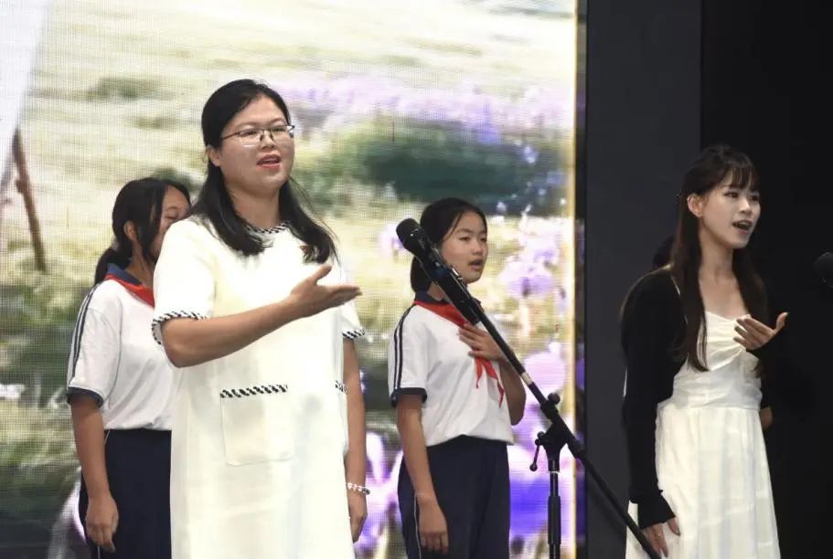 赤沙小学学生带来歌曲《花开中国》,他们歌声整齐清亮,以质朴而真挚的演唱,唱出了对祖国繁荣昌盛的美好祝愿;