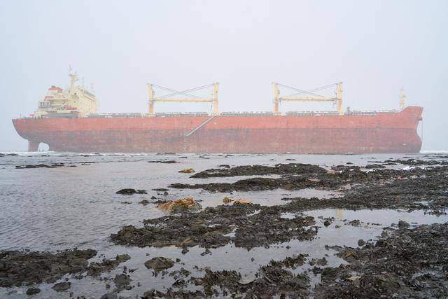这是3月30日在俄罗斯萨哈林岛涅韦尔斯克港附近海域拍摄的搁浅的中国货轮“安洋-2”号。 新华社发(郭飞洲摄)