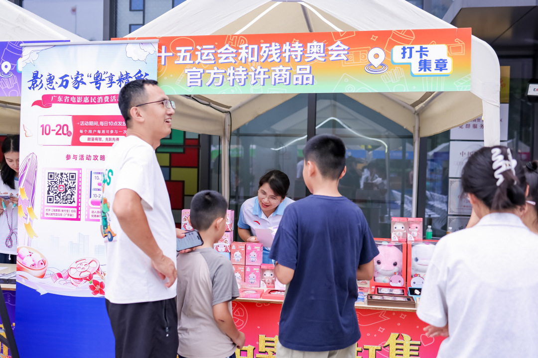 “跟着电影来赶集”活动创新打造“电影放映+‘文旅·美食·体育’消费特色集市”联动模式,15个主题摊位汇集十五运会和残特奥会官方特许商品、广东21地市影视精品旅游线路、体育装备、非遗文创及岭南特色美食,为市民带来一站式消费嘉年华。