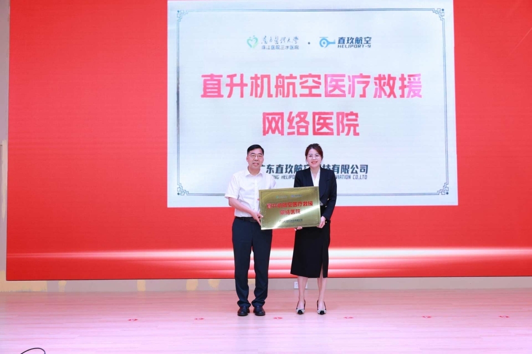 直升机航空医疗救援网络医院授牌。携手广东省玖航空科技,搭建危重症空中生命通道。
