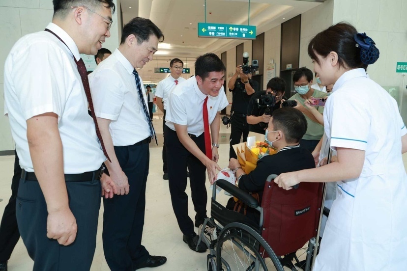 仪式结束后,医院领导班子集体前往住院部一楼迎接首批转院患者。在温馨的欢迎仪式中,院领导亲自为患者送上鲜花和健康礼包,各病区医护团队以"一对一"专属服务模式,为患者提供从入院登记到病房安置的全流程贴心服务。首批投入使用的七大重点科室(心血管内科、肿瘤内科、普通外科、关节运动医学科、妇科、中医科、重症医学科)均配备了智能化医疗设备和舒适化病房设施。